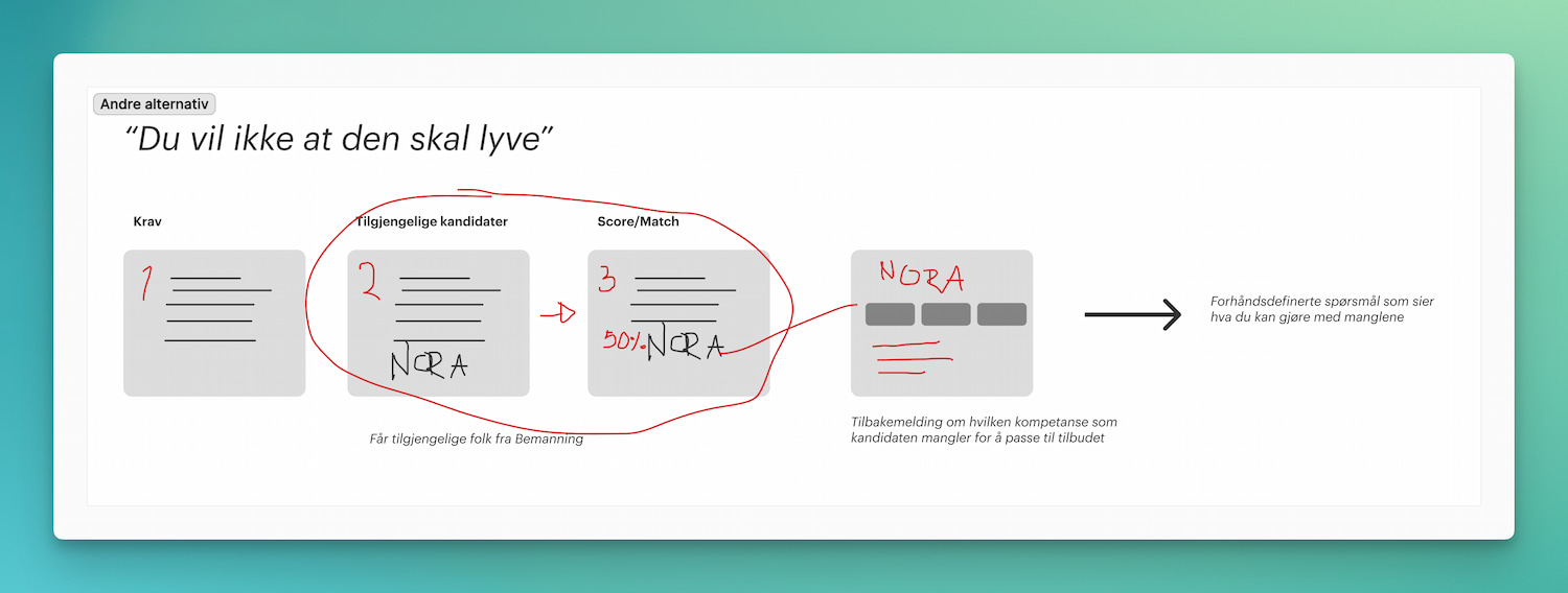 Hvis vi skal lage et verktøy som er genuint nyttig må vi også være trygge på at informasjonen stemmer. Skissene viser én mulig måte vi kan løse det på, og det tok meg 3-5 minutter å tegne det opp. Det er altså en utrolig kjapp måte å utforske en problemstilling på, og sammenhengen mellom de ulike stegene som følger, men det er viktig å være inneforstått med konteksten av krusedullene.