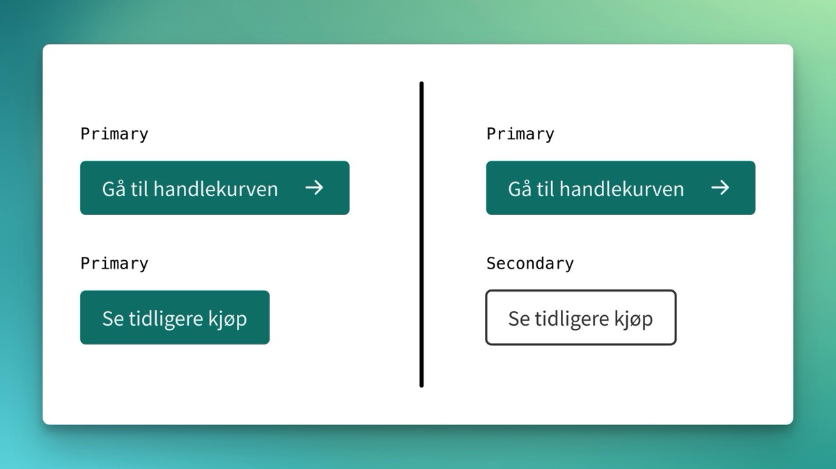 De fortløpende vurderingene der er nok noe de fleste designere gjør uten å tenke på det. Om du oppdager at du har for mange knapper i designet ditt som har fått en “primary” funksjon, altså at den skal skrike til sluttbrukeren for å si “HER SKAL DU TRYKKE FOR Å KOMME DEG VIDERE”, så ville du kanskje ikke kalt det en “usability issue”. Men du ville nok anerkjent det som en utfordring i brukeropplevelsen.