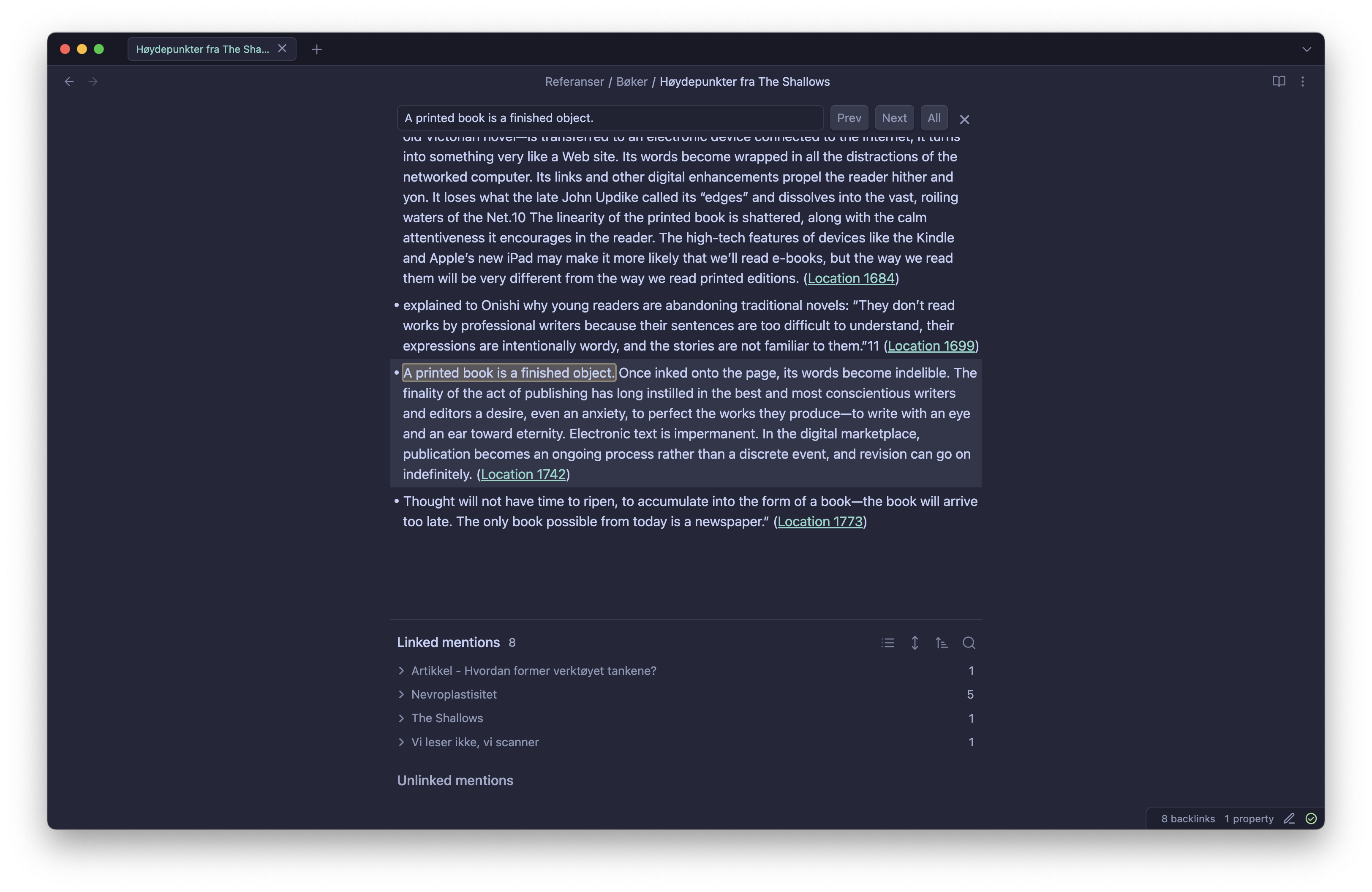 Nederst på bildet under (under Linked mentions-seksjonen) kan du også se hvilke notater som stammer fra høydepunktene fra den boka.