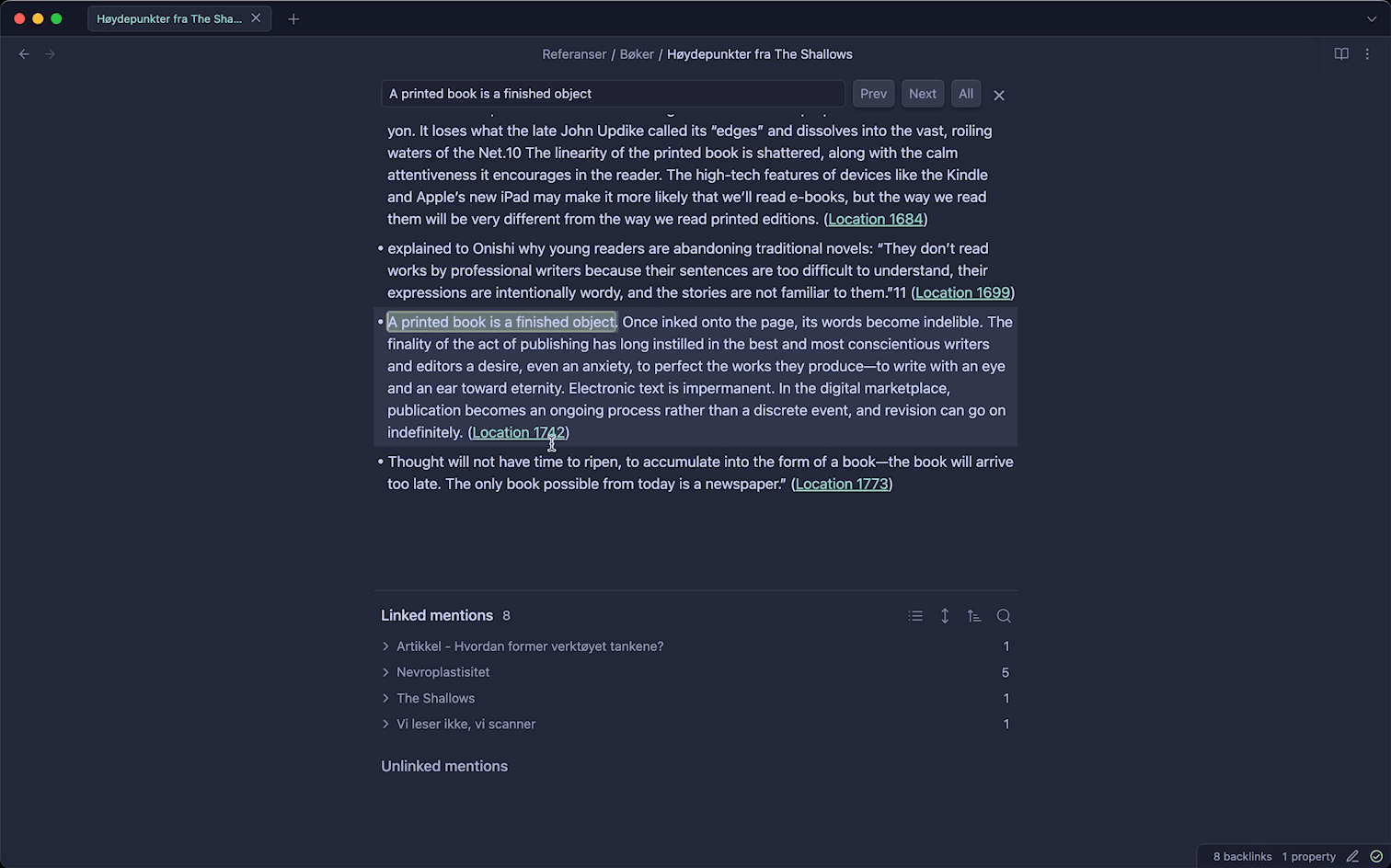 Og bare for å ta det hele ett steg lenger så kan du også gå tilbake til selve kilden. Så når det gjelder bøker kan jeg klikke på linken i Obsidian-notatet hvor det står f. eks Location 1742, også blir jeg sendt nøyaktig til den sida der hvor setningen befinner seg, i den boka, på Kindle-appen på dataen.