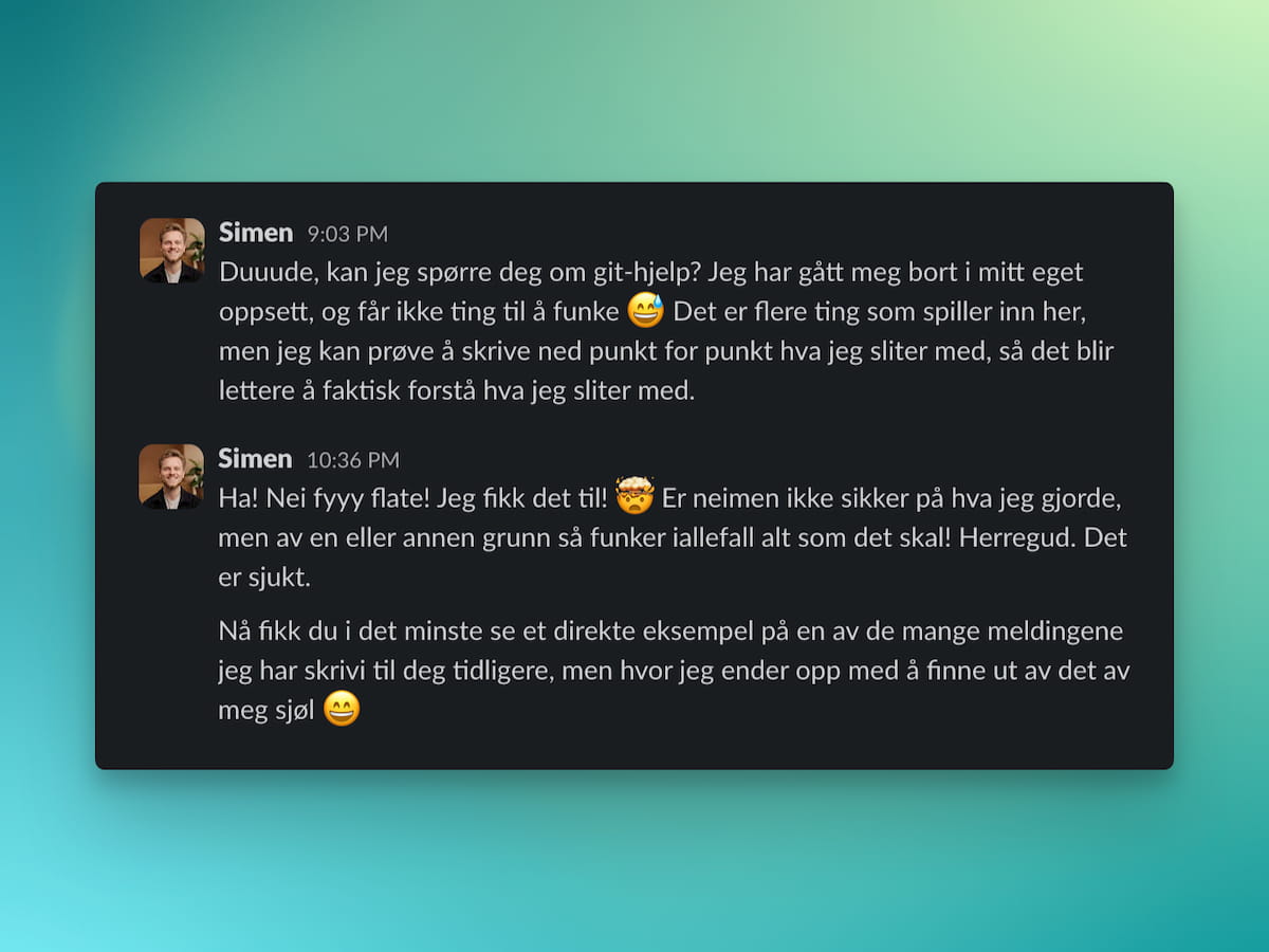 I prinsippet gjør jeg det samme når jeg skriver til Truls Henrik. Jeg bare bruker han som en slags “proxy”. Jeg ser for meg at jeg skal forklare det til nettopp han. Da prøver jeg også å formulere meg på en tydelig måte. Samtidig så vil jeg ikke kaste bort tida hans, så det er viktig for meg å kunne vise at jeg har prøvd å finne ut av det sjøl. Den følelsen motiverer meg også til å gi det ett ekstra forsøk, før jeg gir meg, og sender meldinga. Og det er som regel da jeg finner en løsning.