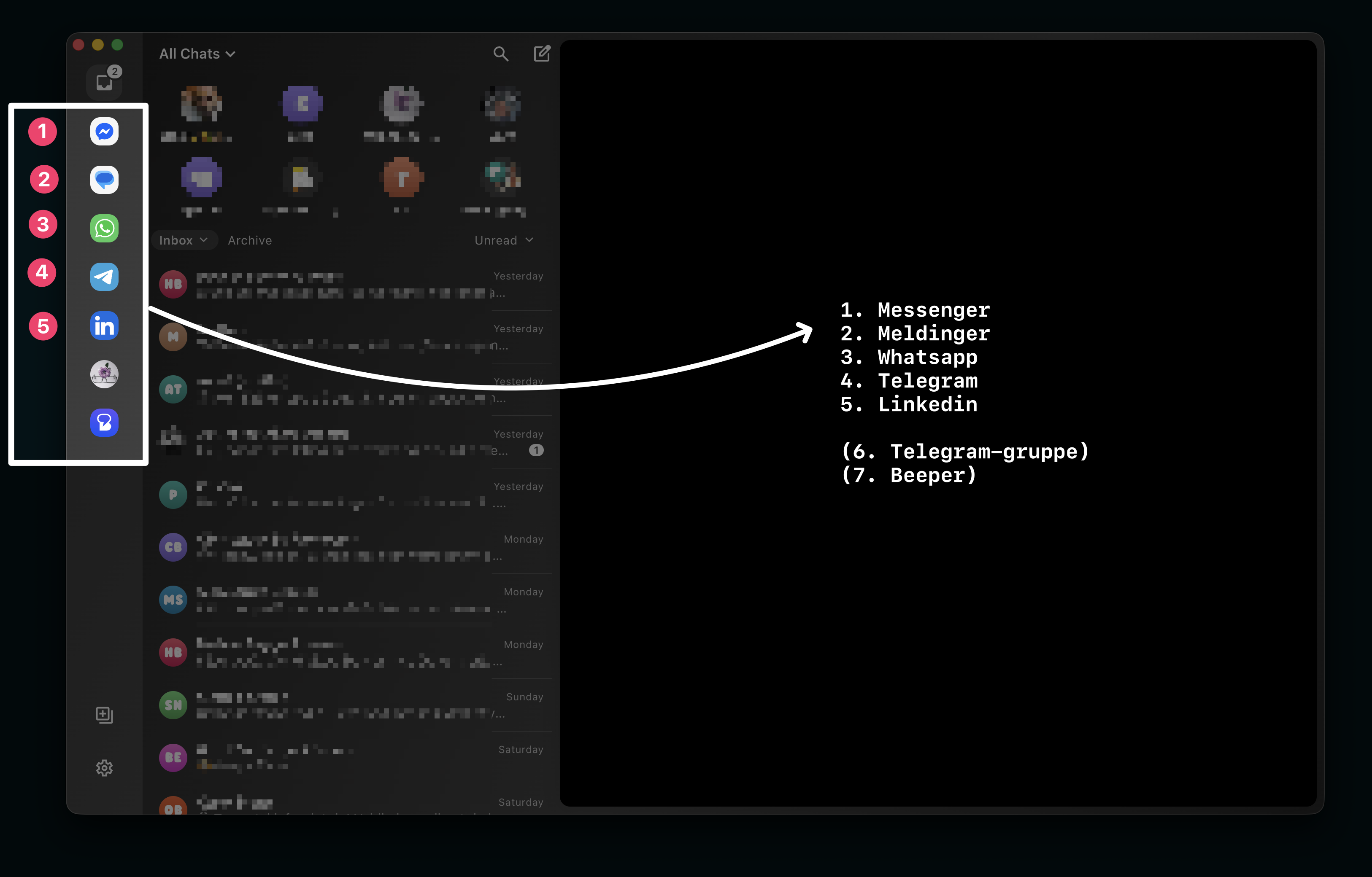 For å kompensere for å sende meldinger fra dataen eller iPaden har jeg begynt å bruke Beeper. Som er en app som lar deg koble sammen mange meldingstjenester i én. Og som finnes til android/mac/ipad/iphone.