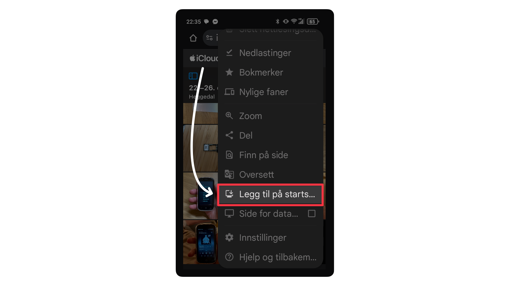Som en Android-telefon så lagres bildene som standard i Google Photos. Men jeg bruker egentlig Bilder-appen på macen til å importere og bare se på bilder, rett og slett. Så her blei det en liten workaround. For ved å hoppe inn på icloud.com i nettleseren, navigere til bildesida, så kan du legge til den på hjemskjermen gjennom Niagara Launcher-appen.