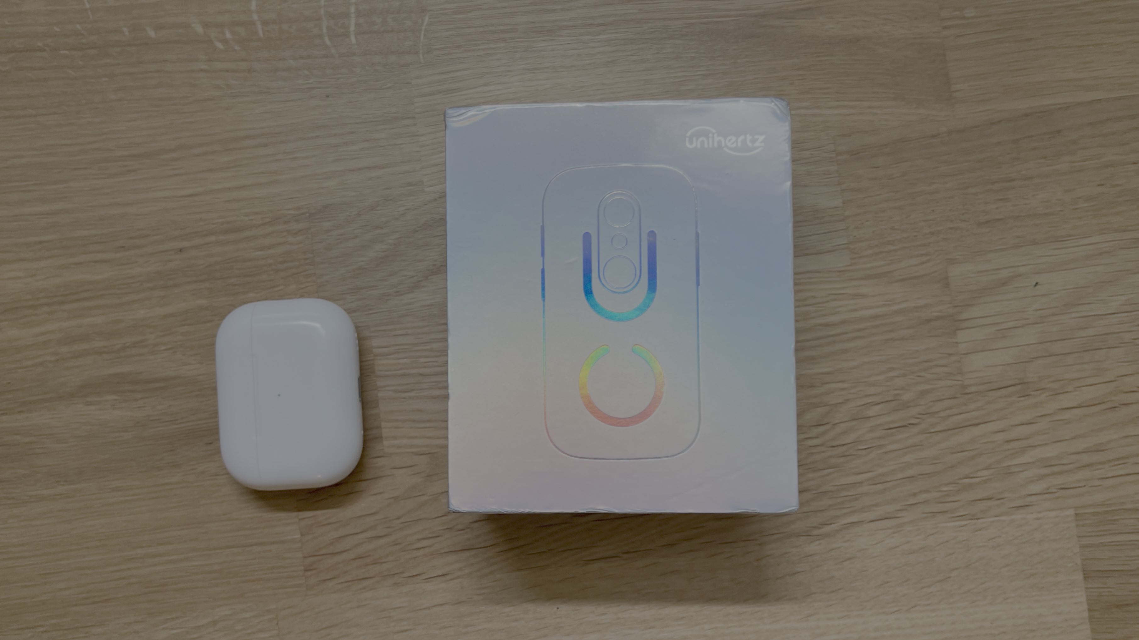 Selve boksen den kommer i er faktisk på størrelse med to airpods oppå hverandre. For den er altså 9,5 cm høy, 5 cm bred, 1,9 cm tjukk.