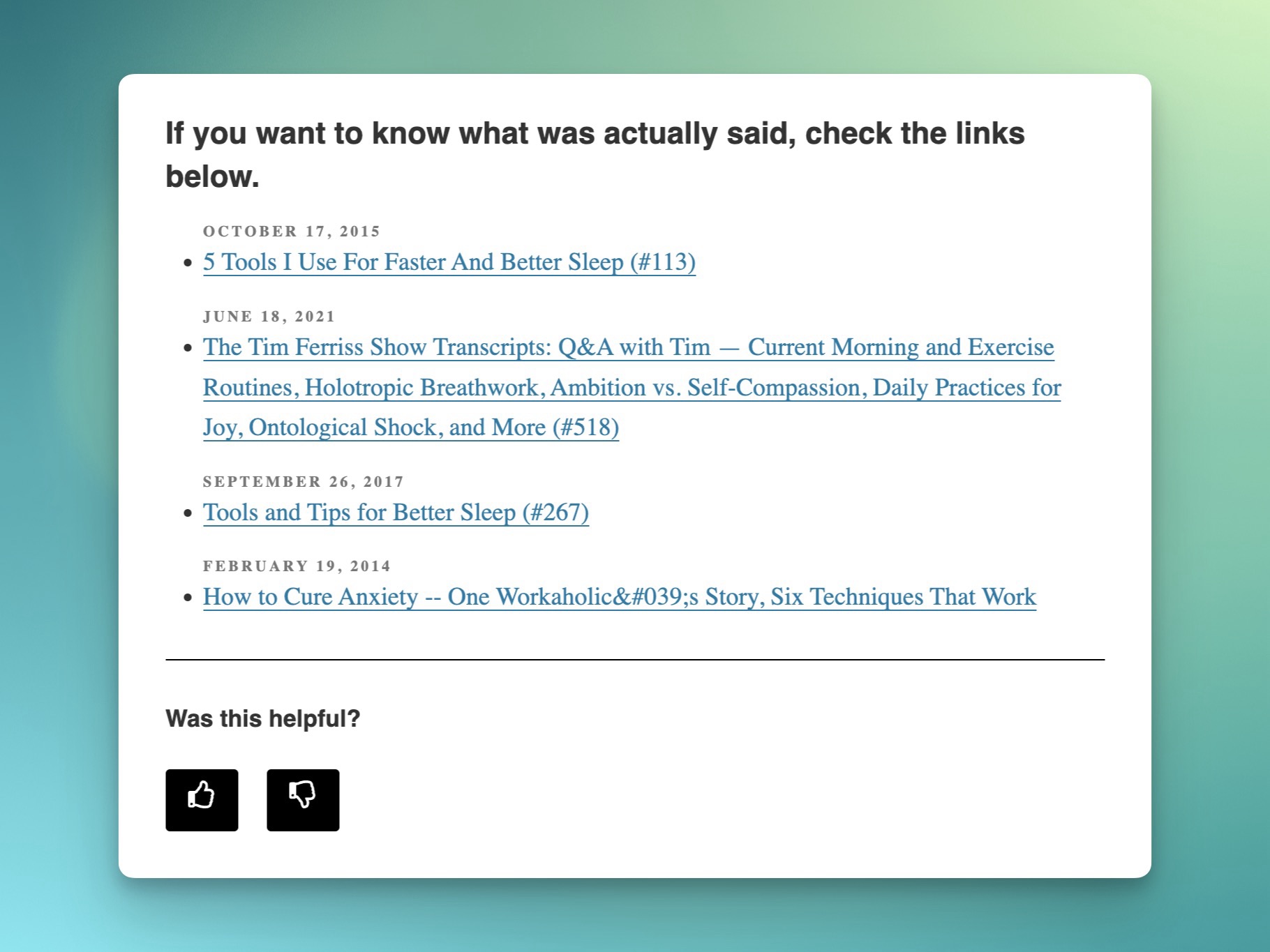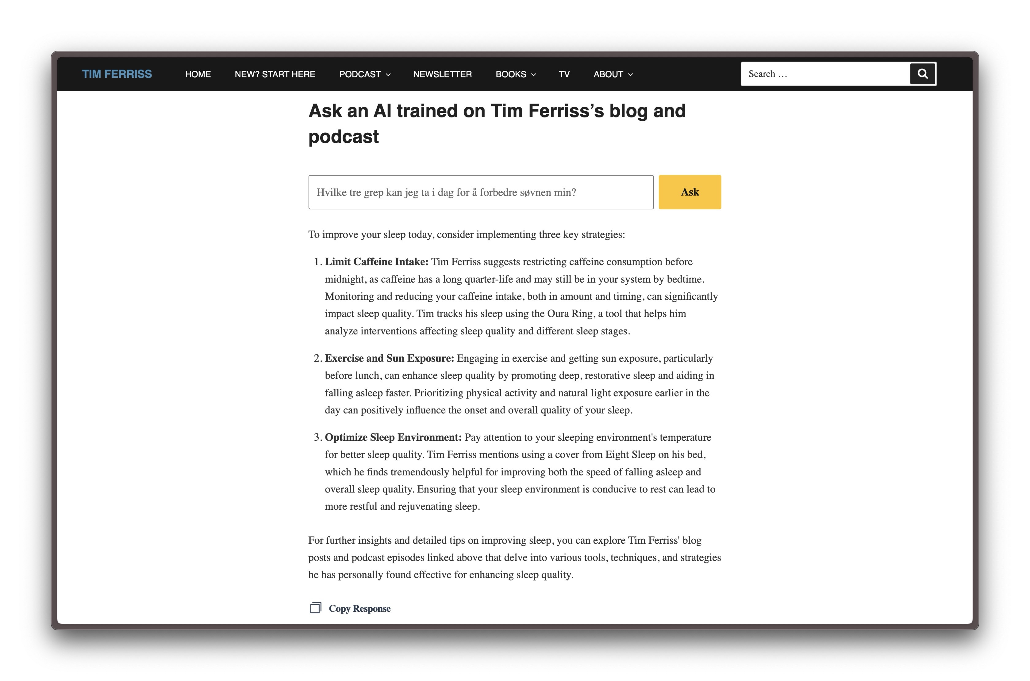 Men! Du kan faktisk teste en chatbot som er trent på episodene fra Tim Ferriss-pådden. Eller.. Strengt talt er det bare et vanlig søk (som er trent opp på transkriberingene fra podkasten). Det er ikke en faktisk chatbot hvor samtalen går fram og tilbake, men det gjør ikke noe, for sluttresultatet blir nok mer eller mindre det samme.