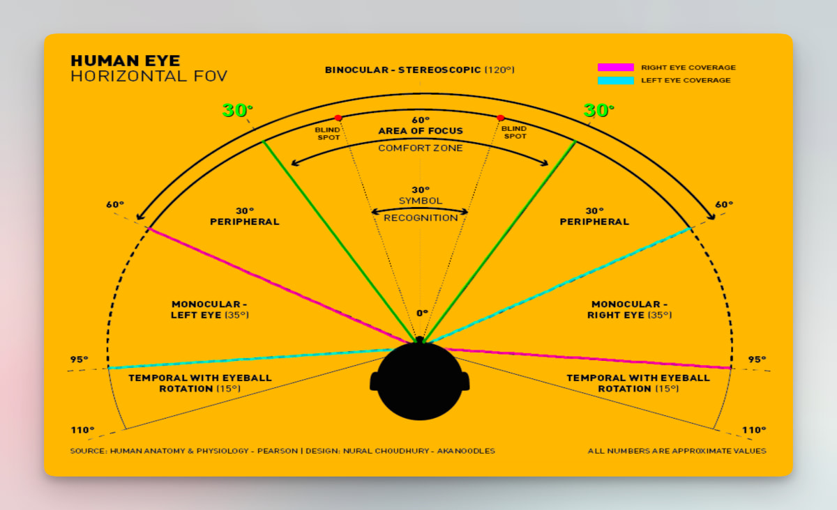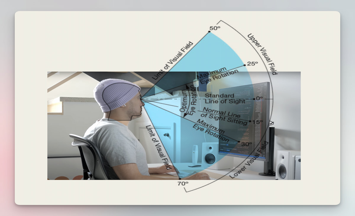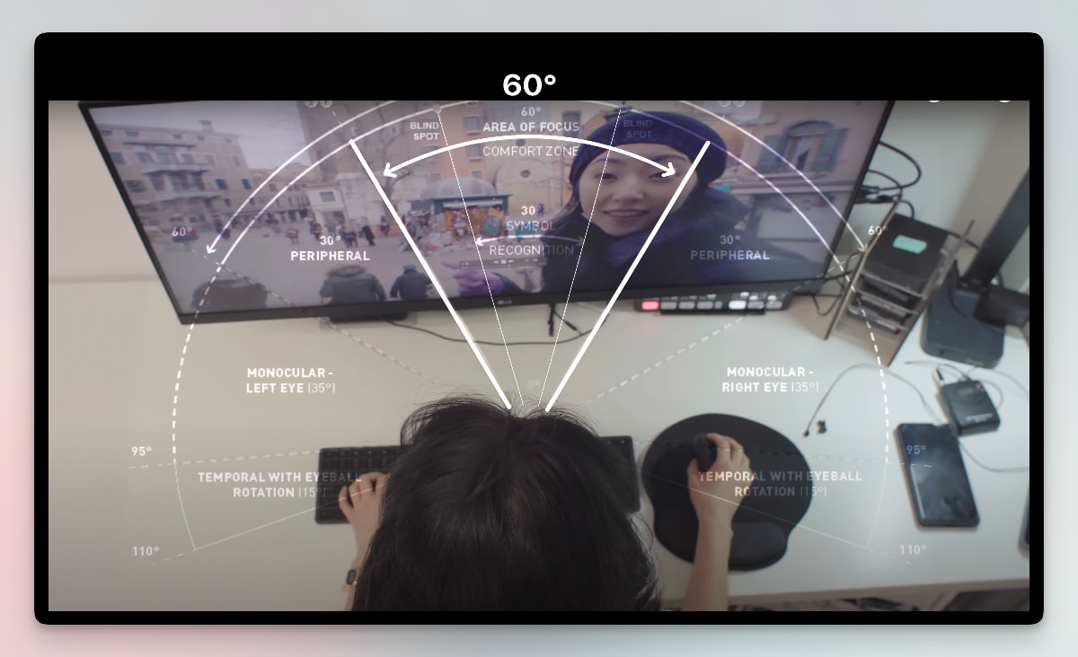 Denne tankebanen starta med en film på youtube, fra arkitekten Dami Lee, som het “The strangest monitor I’ve ever tried”, og da er jo ikke jeg vond å be, kan du tro. I filmen snakker hu blant annet om synsfeltet vårt, og hvordan vi har et fokusområde på ca 60 grader – “komfortsona” som det kalles på illustrasjonen. Den skal du få se igjen, bare i en mer utydelig versjon, så det er verdt å kikke litt nærmere på den.