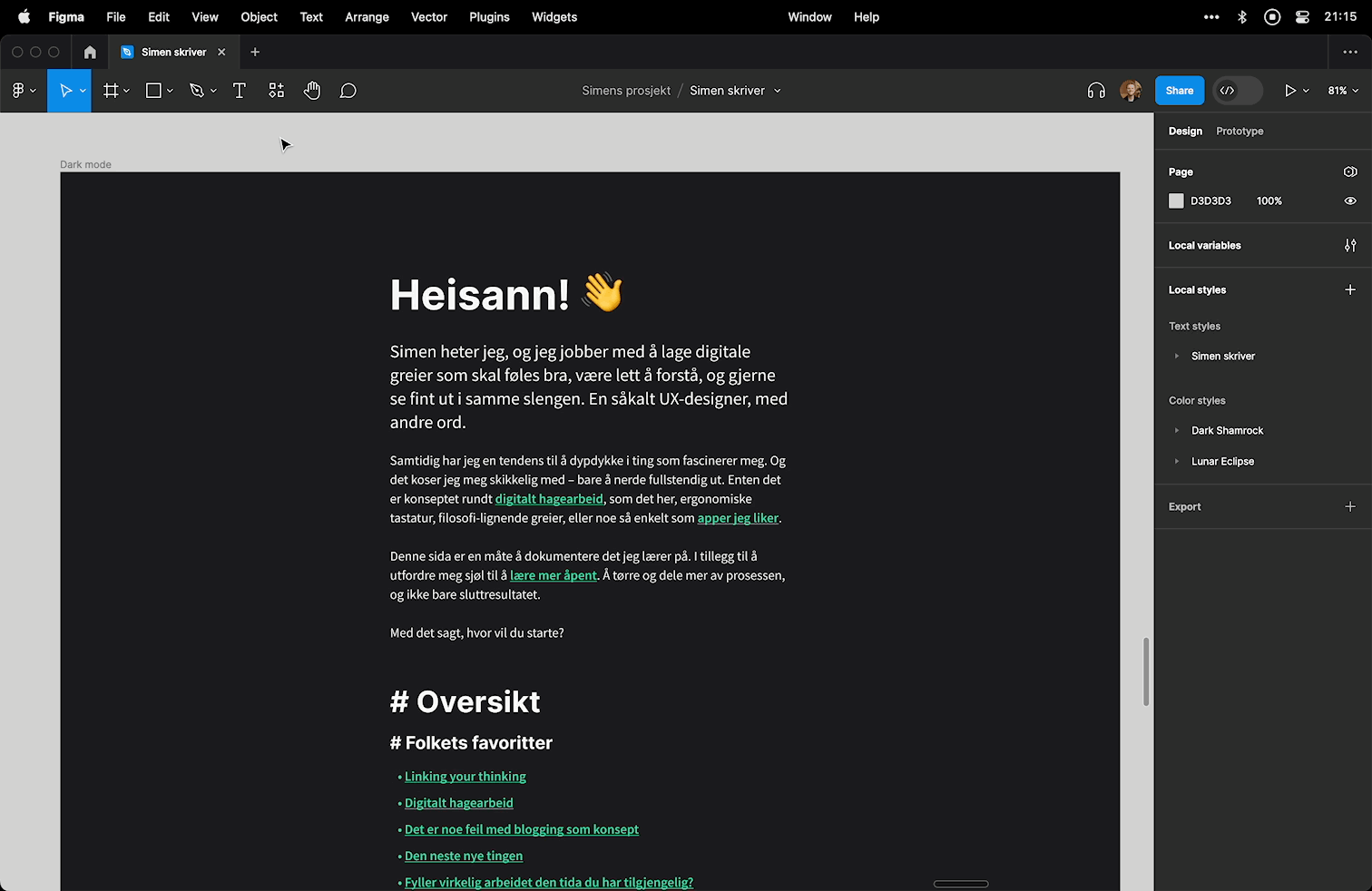 Det her blir for nerdene mine uti der altså, for detta blir nok intenst stammespråk for folk flest. Figma lanserte nylig noe som heter variabler, som lar deg forholdsvis enkelt definere stiler som skal gjelde til ulike formål – for eksempel hvordan light mode og dark mode kan se ut på en hjemmeside, som f. eks Simenskriver.no: