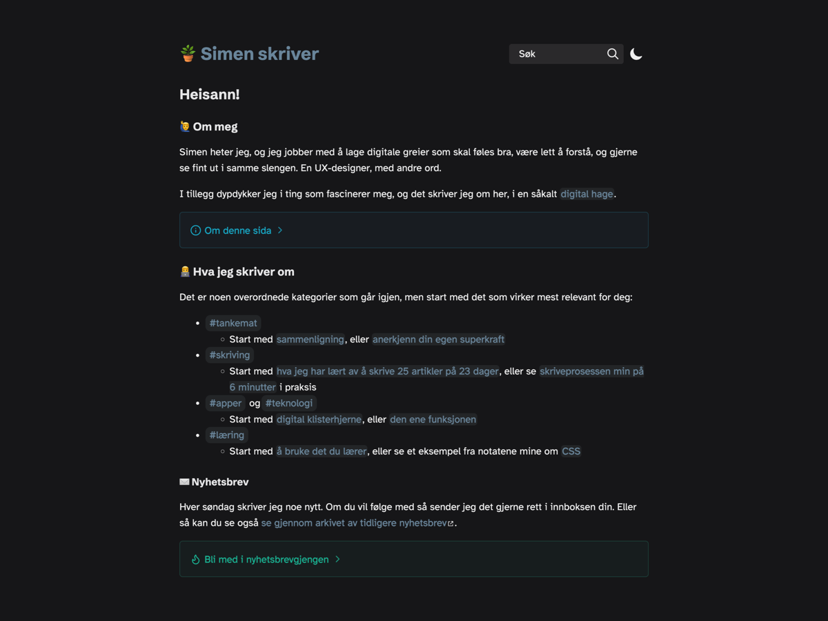 Utover det har jeg prøvd å endre utseendet på linkene i det siste. Det er mye prøving-og-feiling for å finne det rette “elementet”. Siden jeg jobber videre med noen andres kode så må jeg sette meg inn i hva som er hva, og det er ikke alltid like logisk. På bildet under kan du f. eks se at “logoen”, eller skrifta som sier “Simen skriver” øverst til venstre, tilsynelatende forsvant da jeg prøvde å endre de interne, gule linkene. Jeg aner ikke hvorfor, men det vil jeg dykke dypere i.