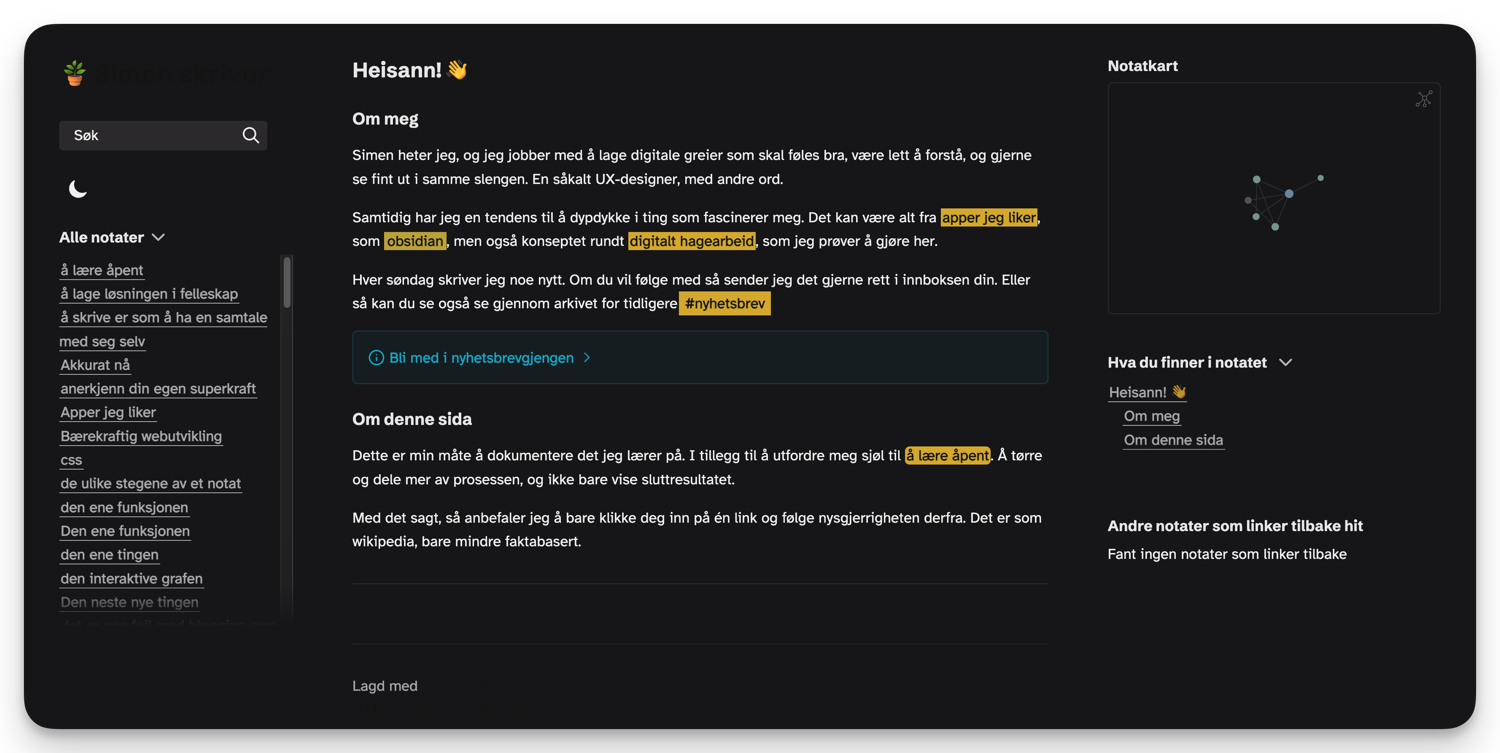 Til tross for så mye fiksing så er det overraskende få notater som er tilgjengelige nå, eller som faktisk fungerer. Det er på grunn av slugs. Og at jeg misforstod hvordan det funka med Github Publisher-pluginen til obsidian 🤦♂️
