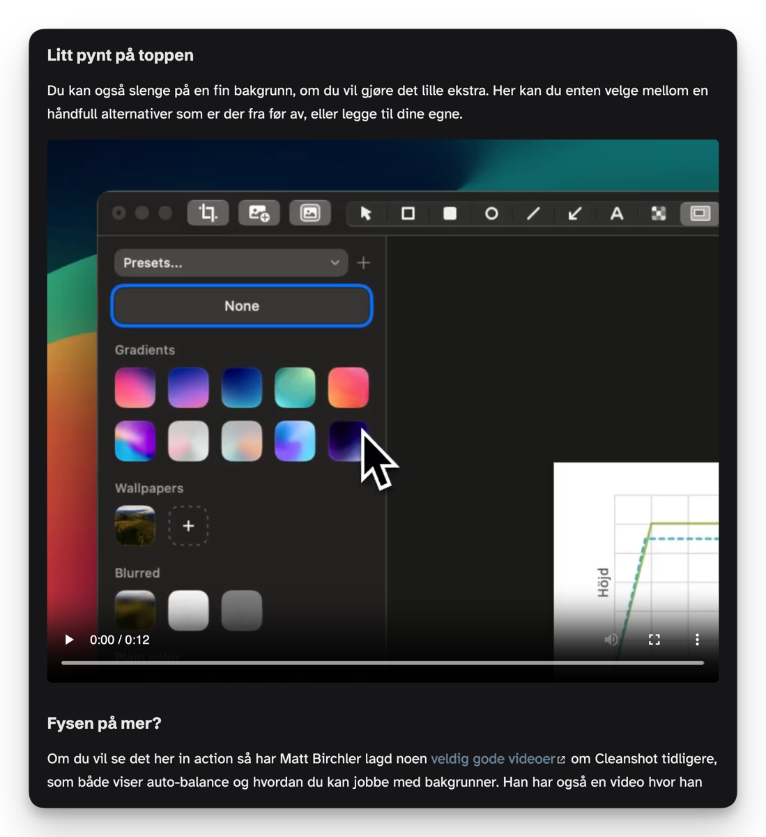 Både lagd og lasta opp nye skjermopptak for å illustrere den ene funksjonen. Fra et teknisk ståsted førte det faktisk til at jeg gikk fra å ha en gif på 40mb til en videofil på 425 kb. Det betyr at fila blei nesten 100 ganger mindre enn opprinnelig 🤯 Det hadde jeg virkelig ikke trodd altså. Samtidig som kvaliteten er høyere, og avspilleren ser ganske så snasen ut, spør du meg.