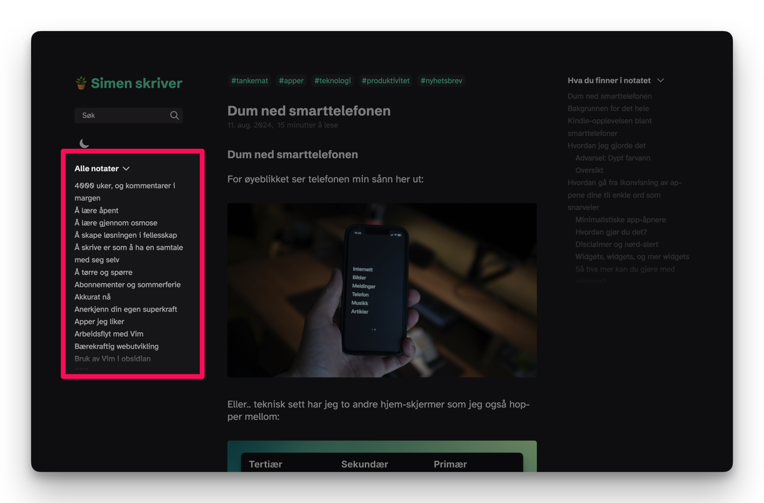 Den oversikten (over alle notater) vises fremdeles på hver enkelte artikkelside, som gir deg muligheten til å utforske videre, men den virka overflødig da jeg fikk lista over alle artiklene på plass på forsida.