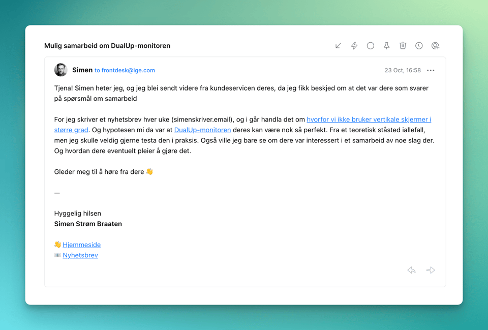 I et øyeblikk av inspirasjon og overraskende lite hemninger så sendt jeg derfor en mail til LG – selskapet som lager den skjermen – og spørte om de var interessert i et samarbeid.