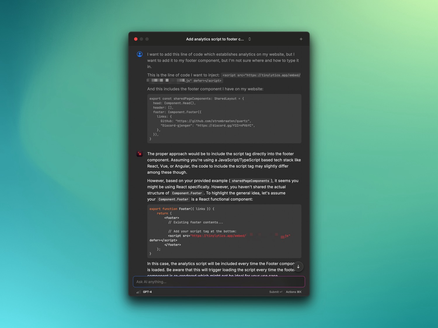 Nedenfor kan du se et eksempel hvor jeg spørte AI-chatten i raycast om hjelp med å implementere tinylytics på hjemmesida mi. Tinylytics gjør det samme som google analytics, bare på en veldig liten skala, med personvern i fokus, og med muligheten for mer menneskelig kontakt.